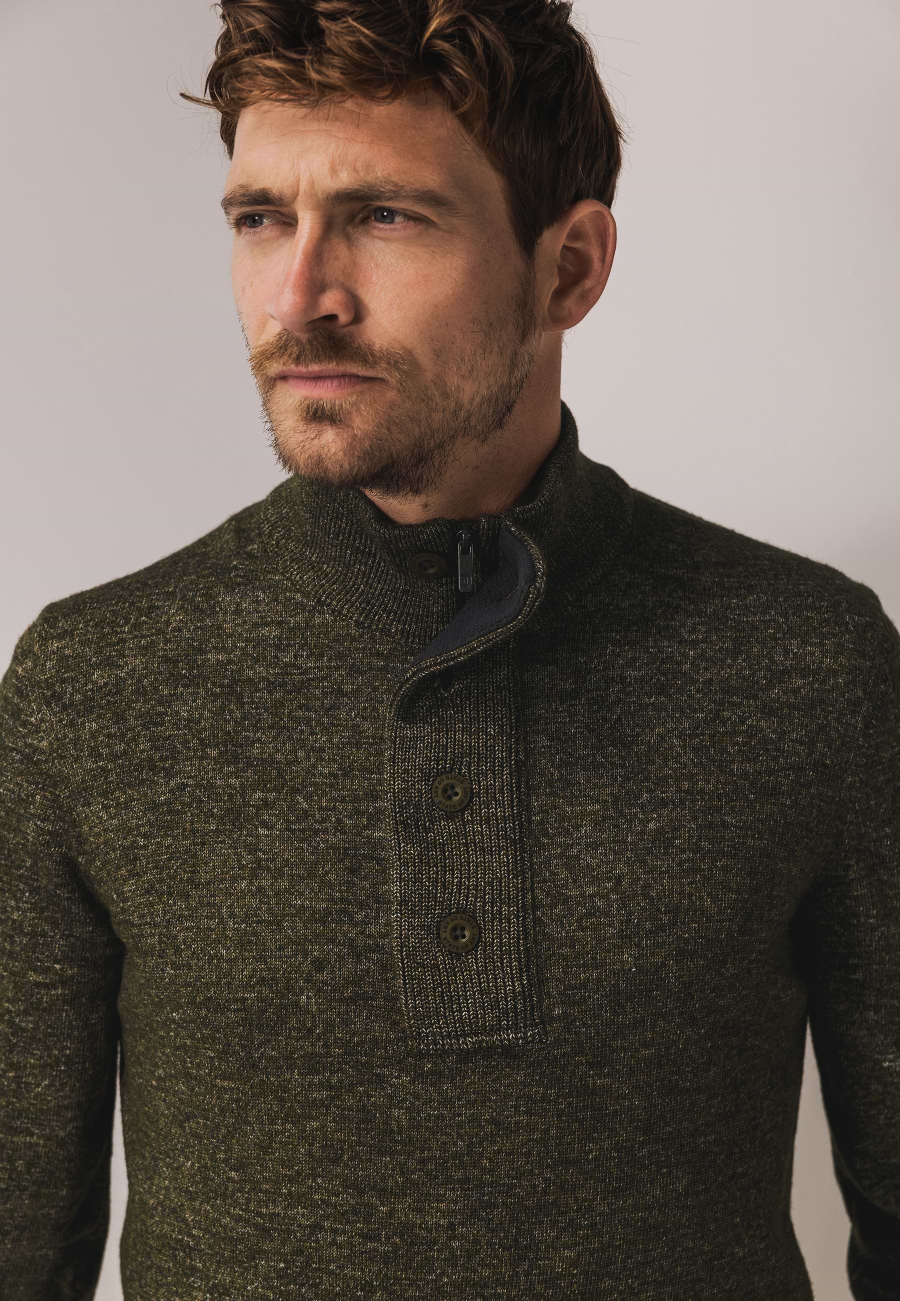 Ce pull chiné, doté d'une fermeture éclair à mi-hauteur et à boutons, a une coupe classique et arbore un écusson en caoutchouc sur la manche. Fabriqué à partir de fil CIPRO, un mélange doux de coton, d'acrylique et de polyester. Cela permet d'obtenir un toucher doux, une tenue durable et une légère brillance.