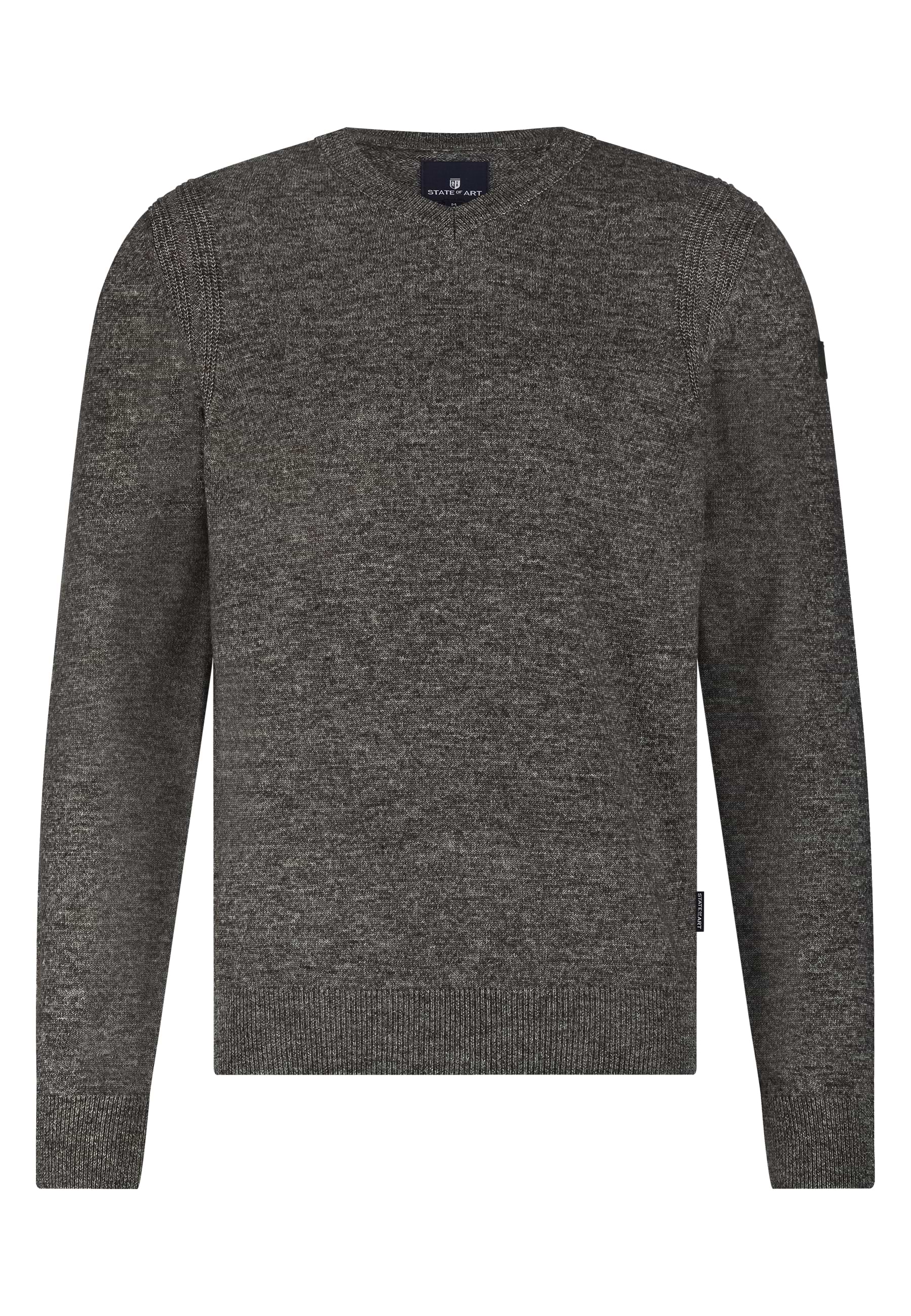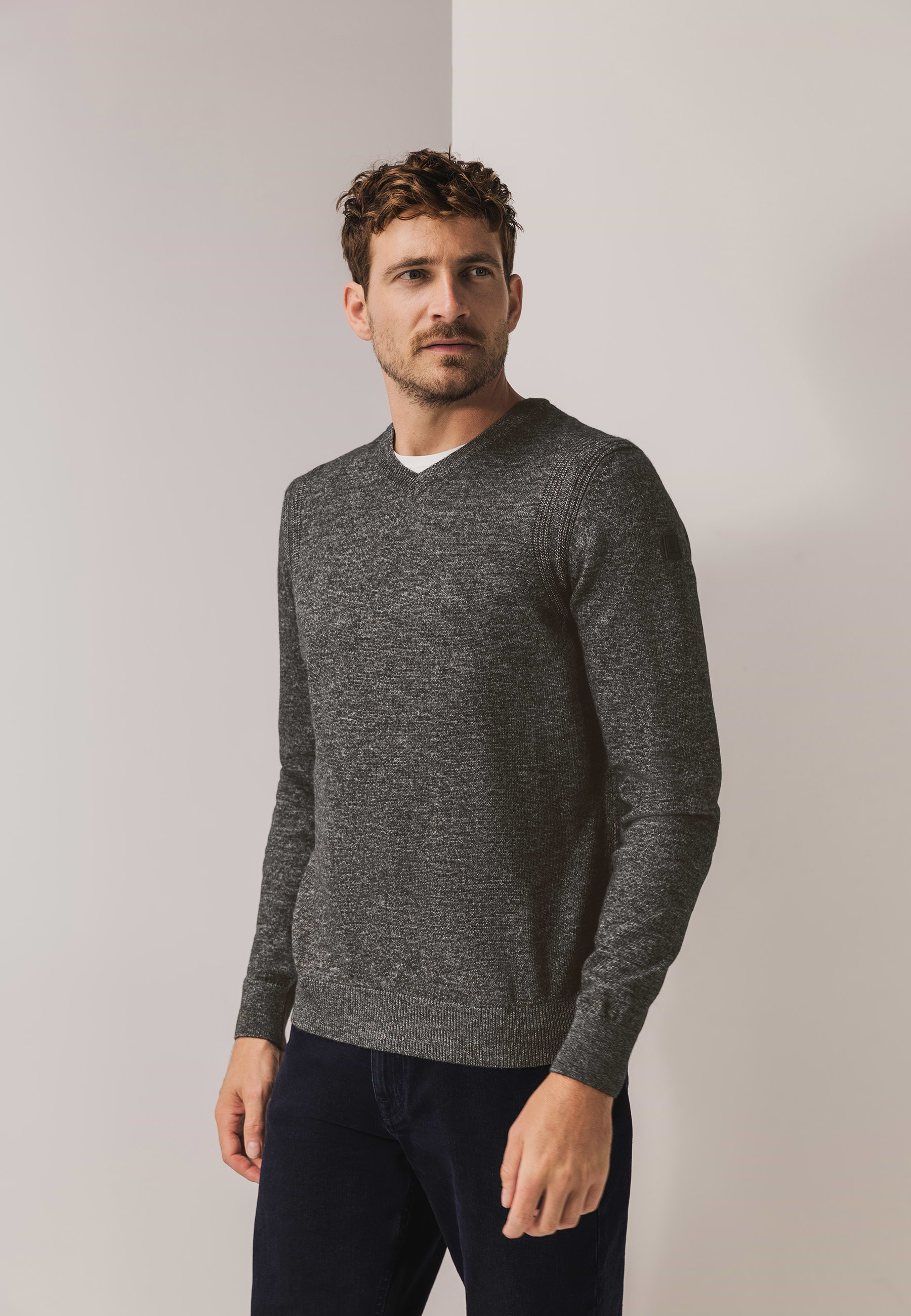 Ce pull à col en V présente un aspect chiné et une coupe classique. Les détails côtelés aux épaules et aux emmanchures ajoutent une touche ludique, tandis que l'écusson en caoutchouc sur la manche complète le design. Le mélange d'acrylique, de coton et de polyester donne un tissu robuste, doux au toucher et qui garde bien sa forme.