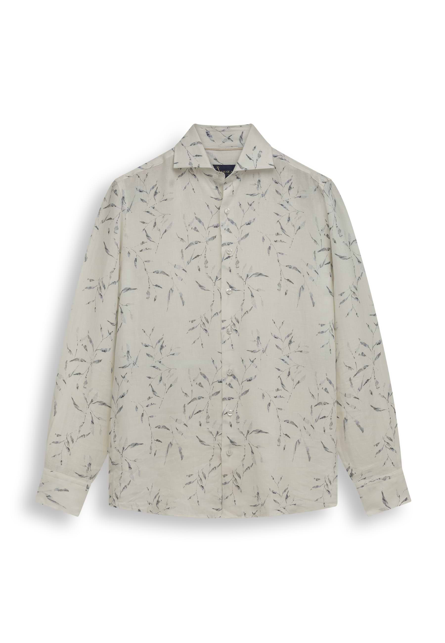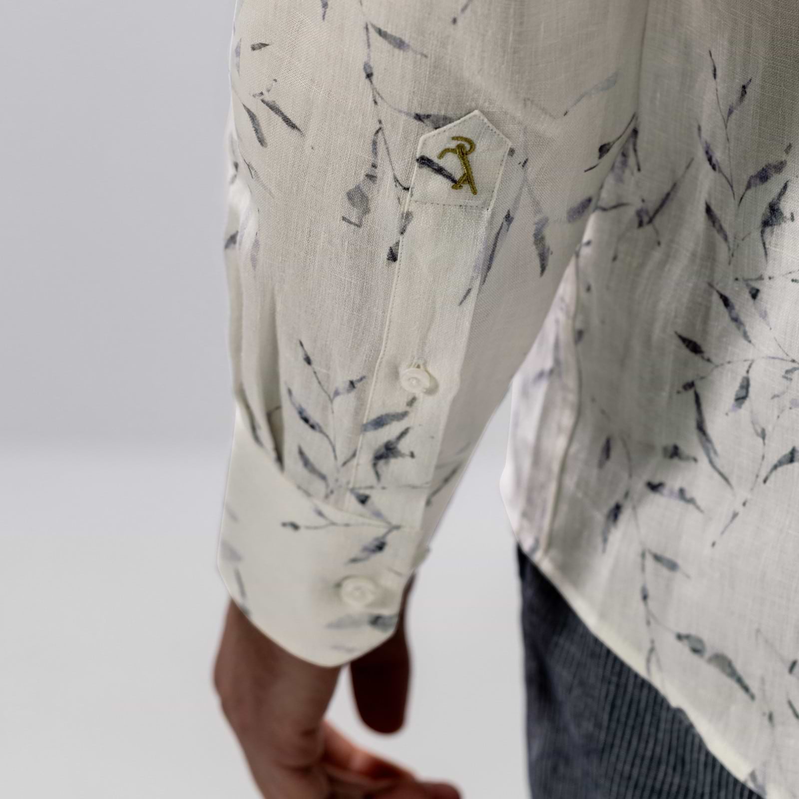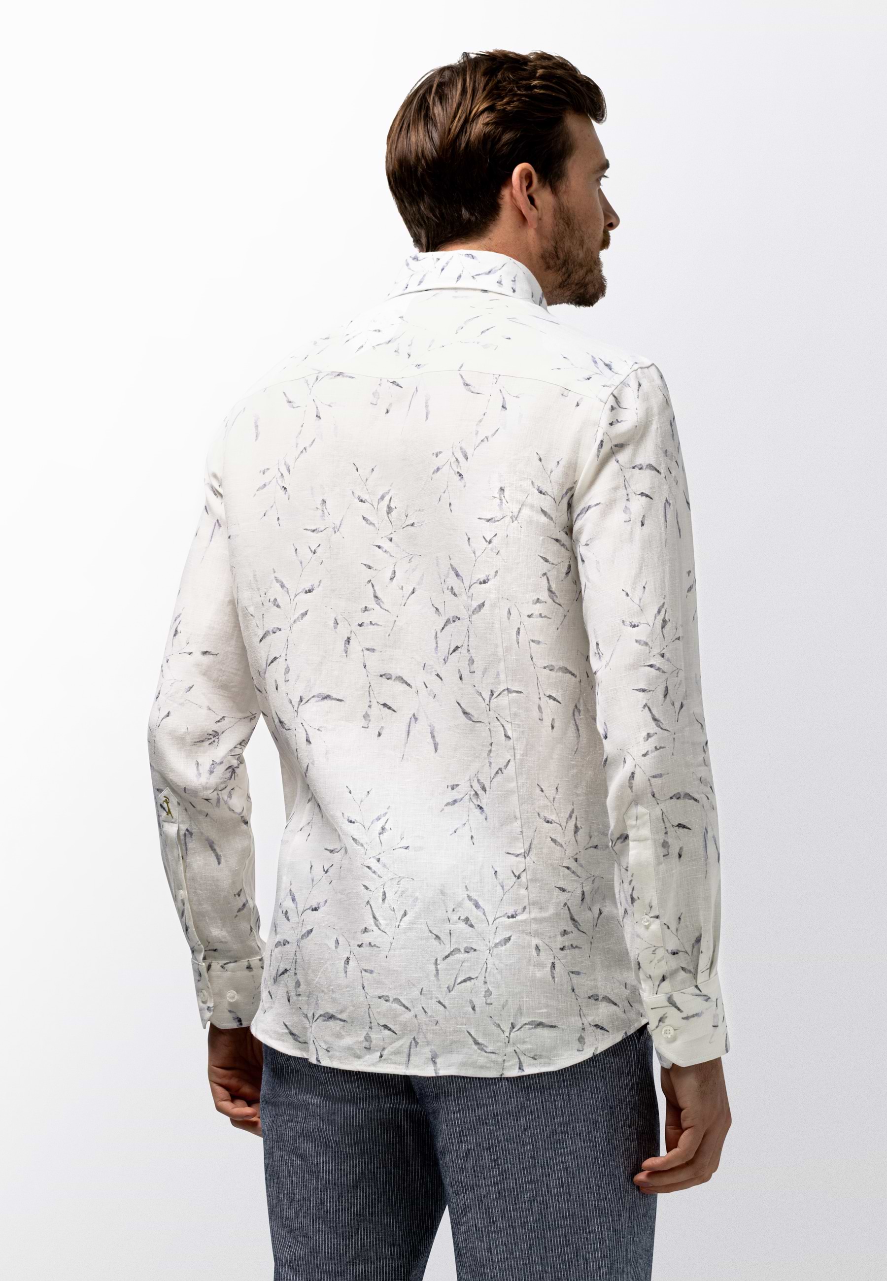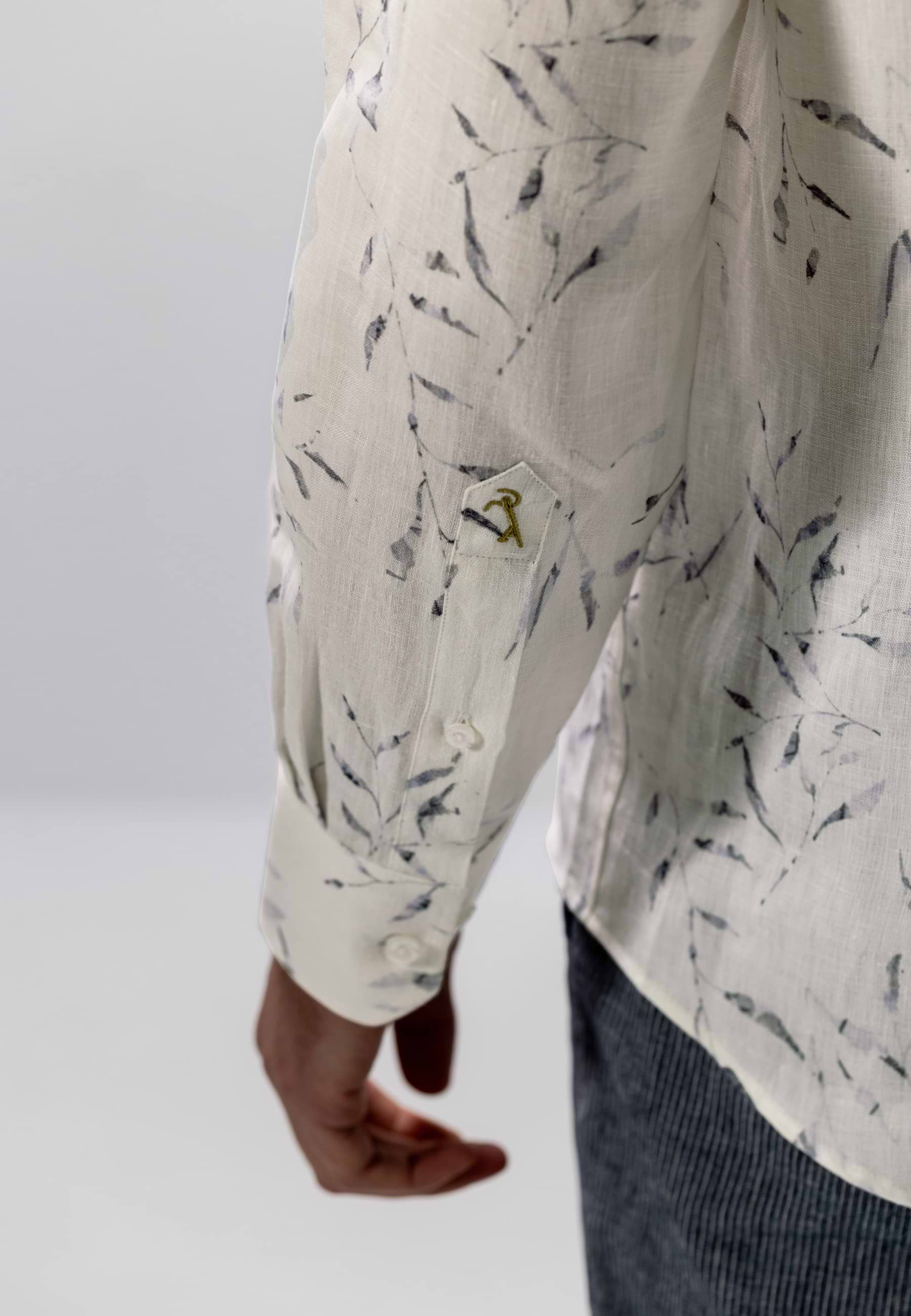 Overhemd uitgevoerd in hoogwaardig linnen met een verfijnde satijn twillstructuur voor een lichte glans en een soepele uitstraling. De regular fit biedt een comfortabele pasvorm, terwijl de botanische print het ontwerp een zomers karakter geeft. Voorzien van een klassieke kraag zonder button-down en afgewerkt zonder borstzak voor een strakke, moderne uitstraling. Een subtiel borduursel op de mouw voegt een verfijnd detail toe.