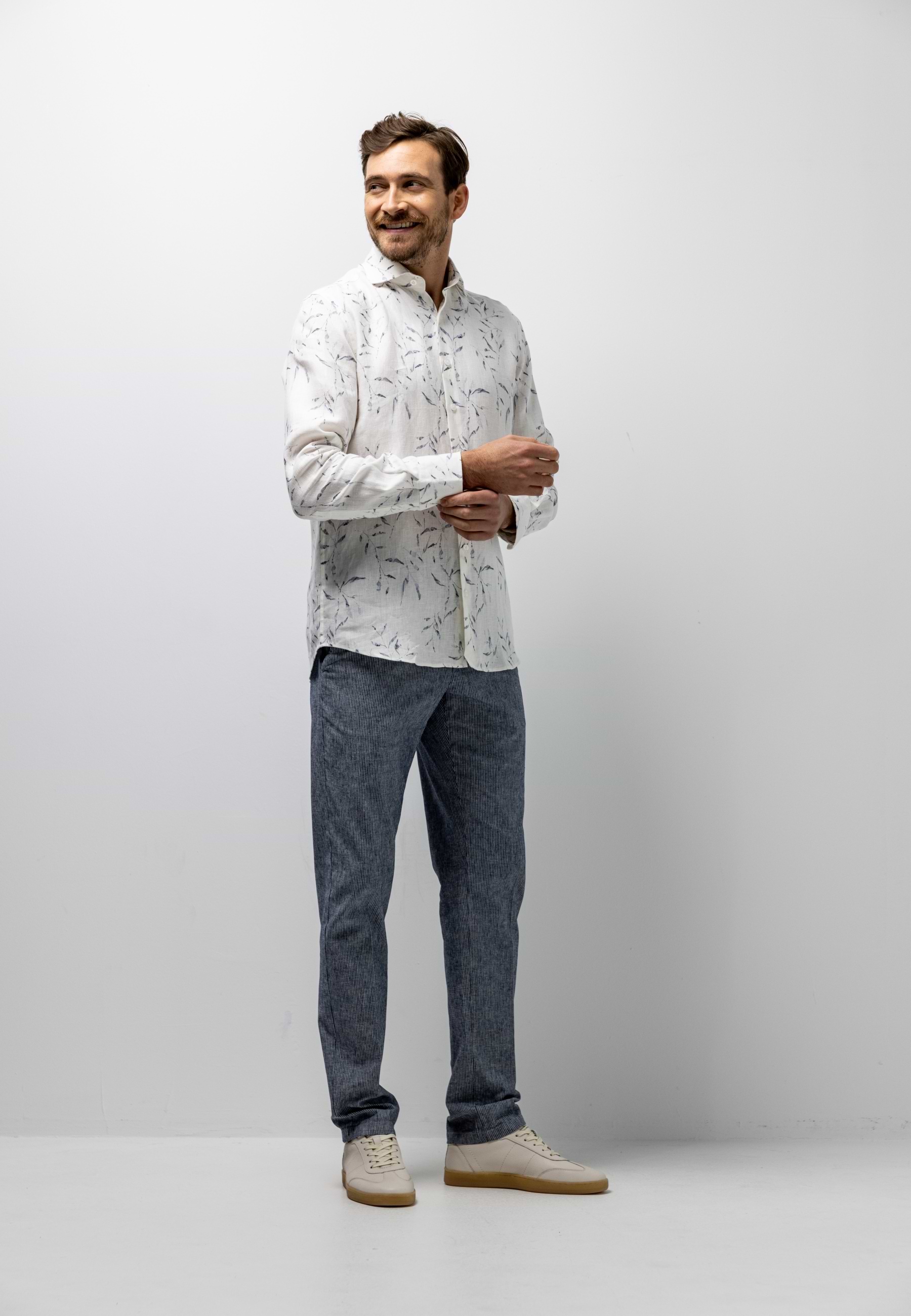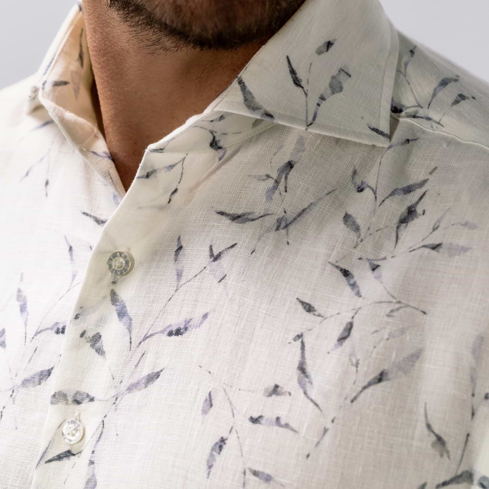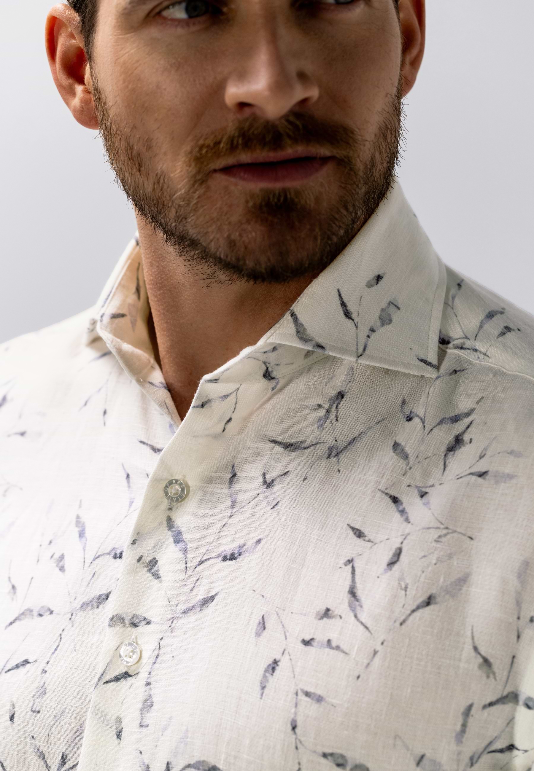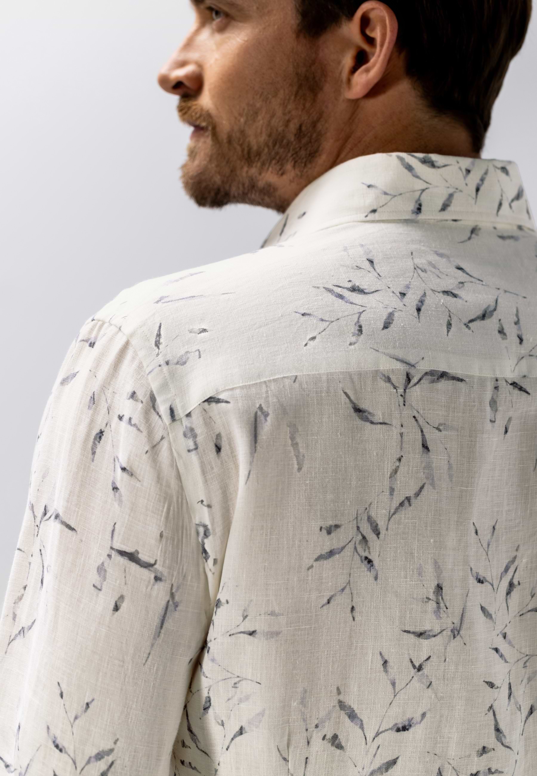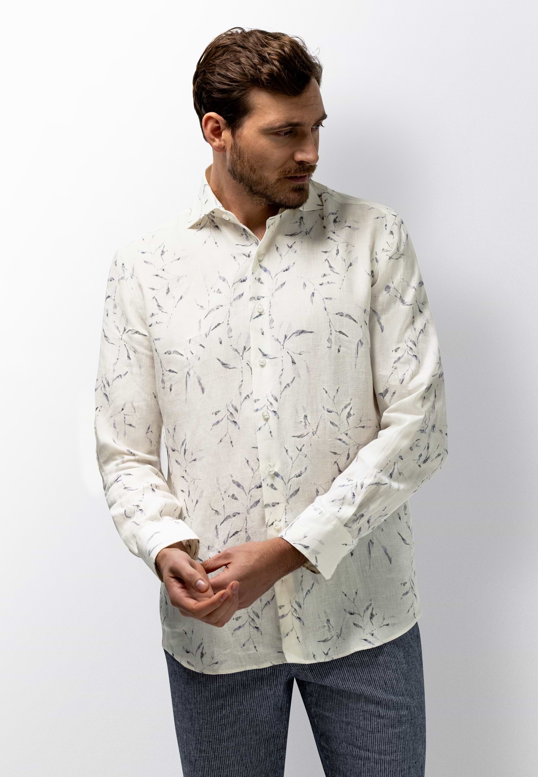 Overhemd uitgevoerd in hoogwaardig linnen met een verfijnde satijn twillstructuur voor een lichte glans en een soepele uitstraling. De regular fit biedt een comfortabele pasvorm, terwijl de botanische print het ontwerp een zomers karakter geeft. Voorzien van een klassieke kraag zonder button-down en afgewerkt zonder borstzak voor een strakke, moderne uitstraling. Een subtiel borduursel op de mouw voegt een verfijnd detail toe.
