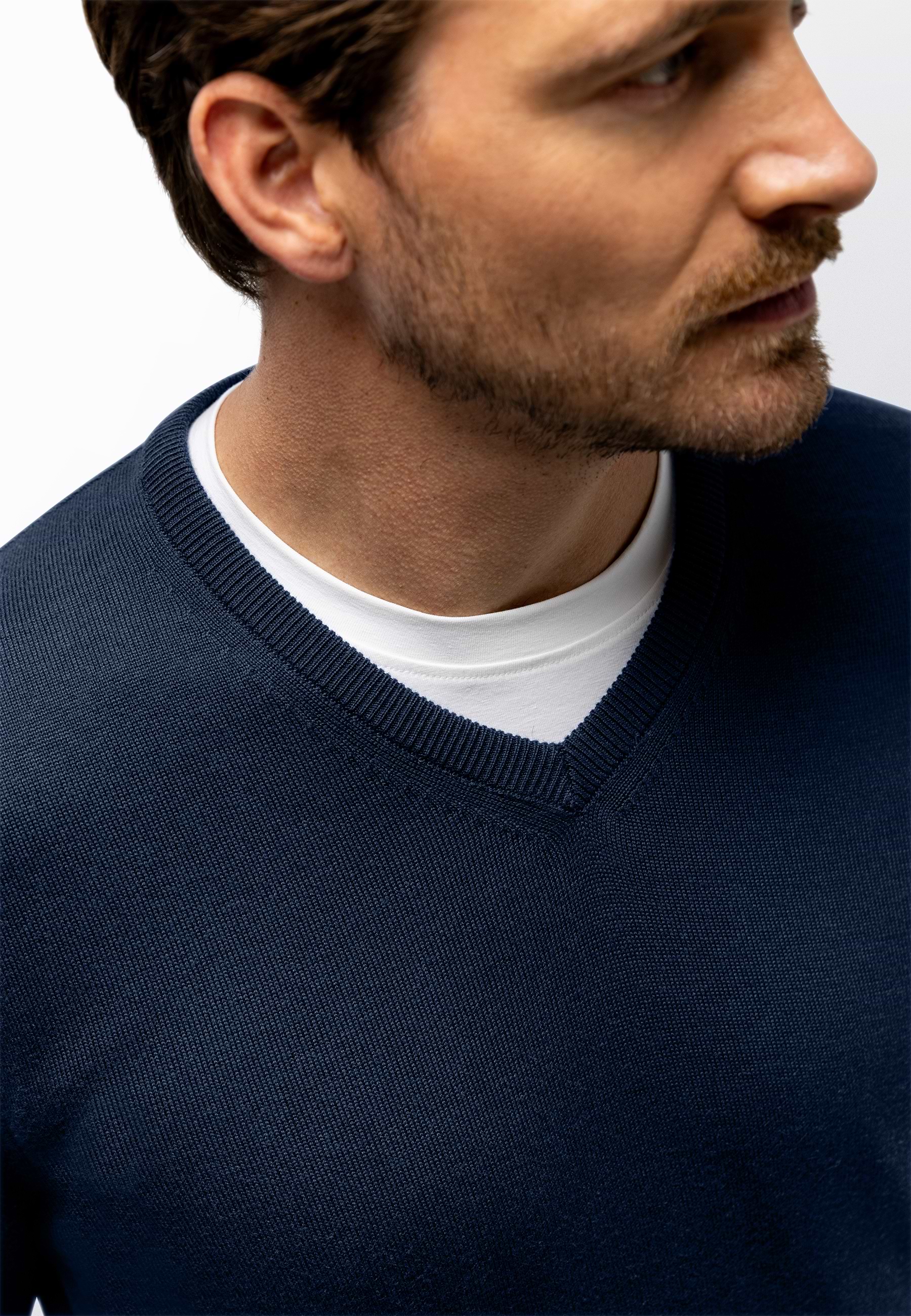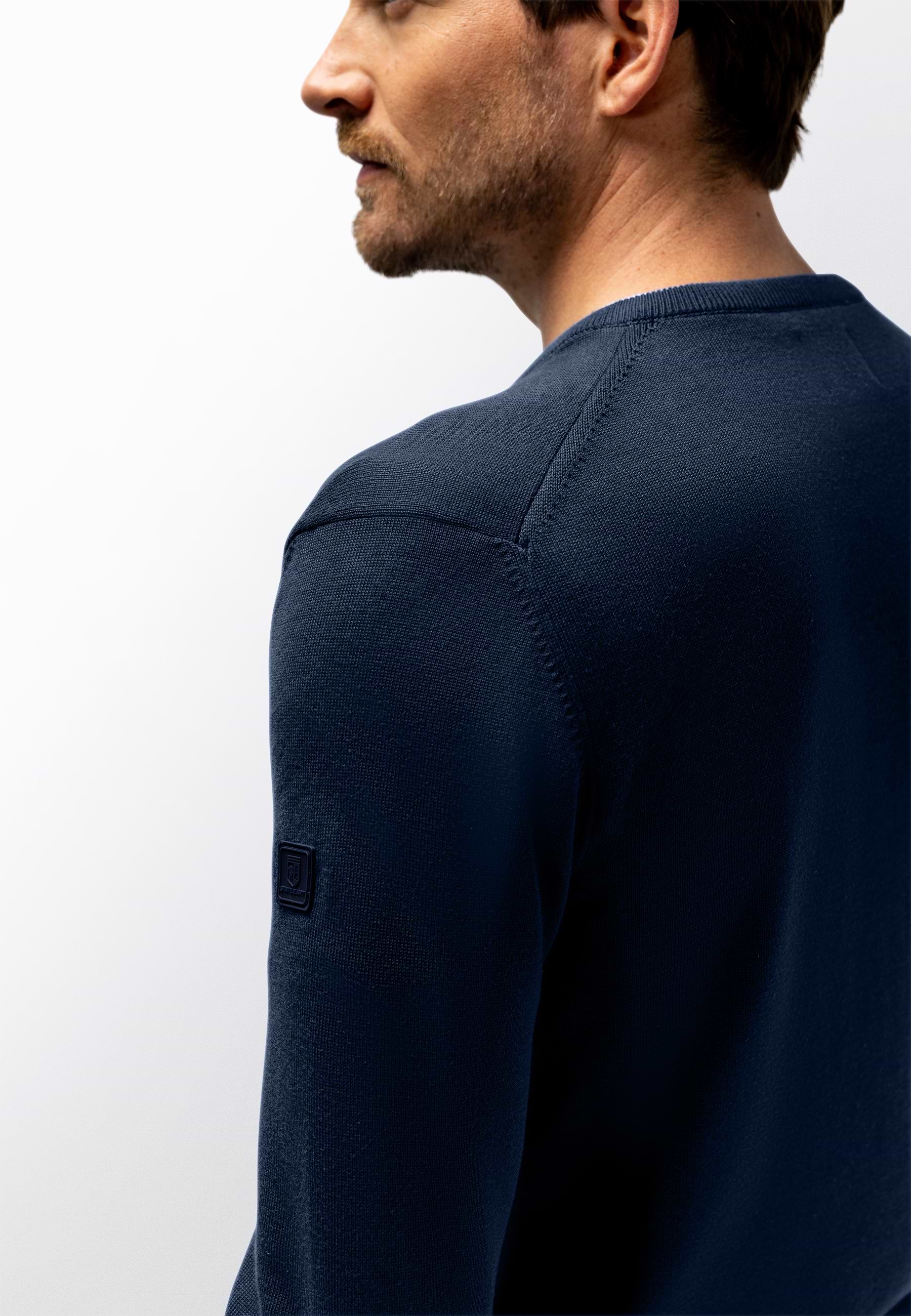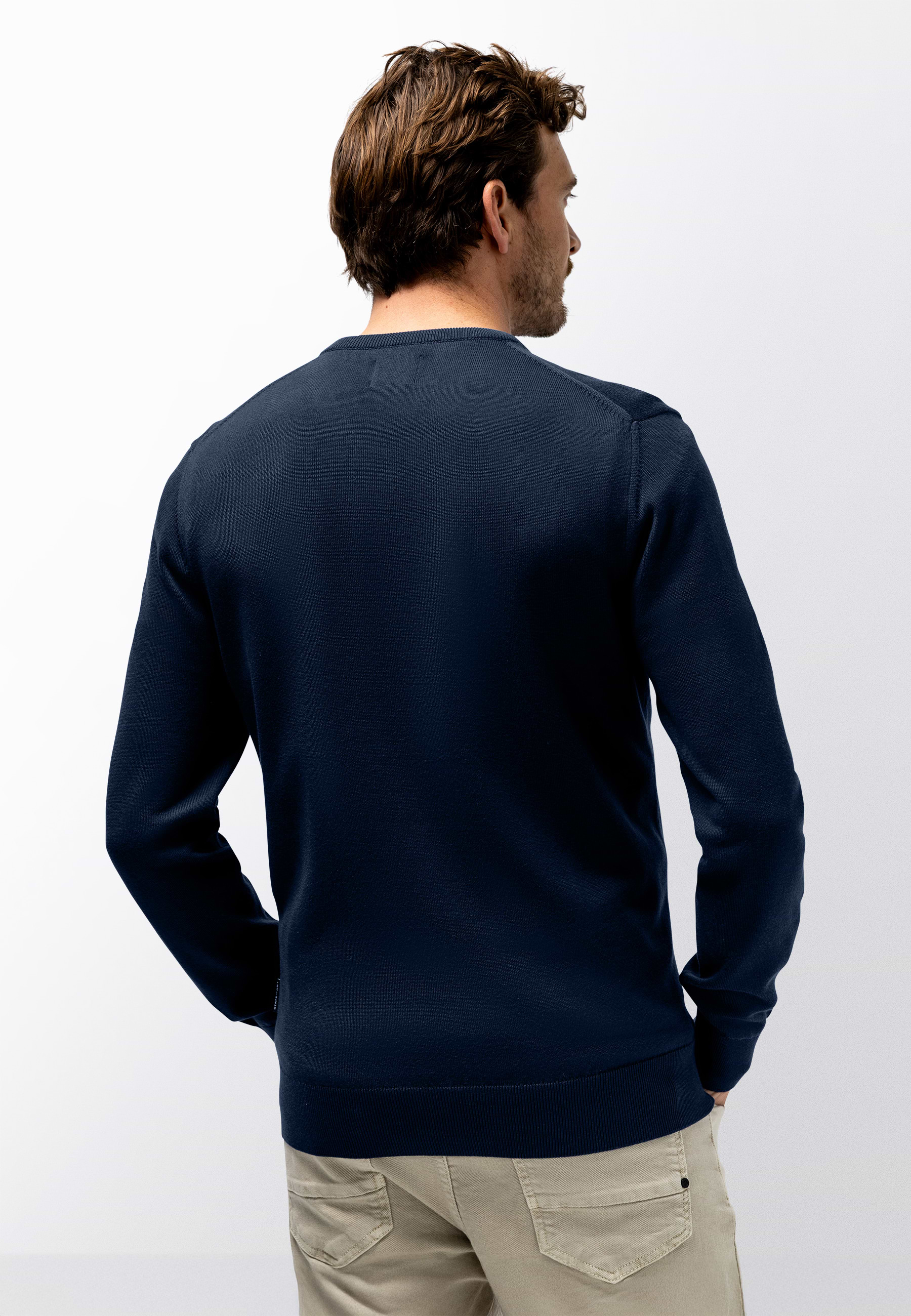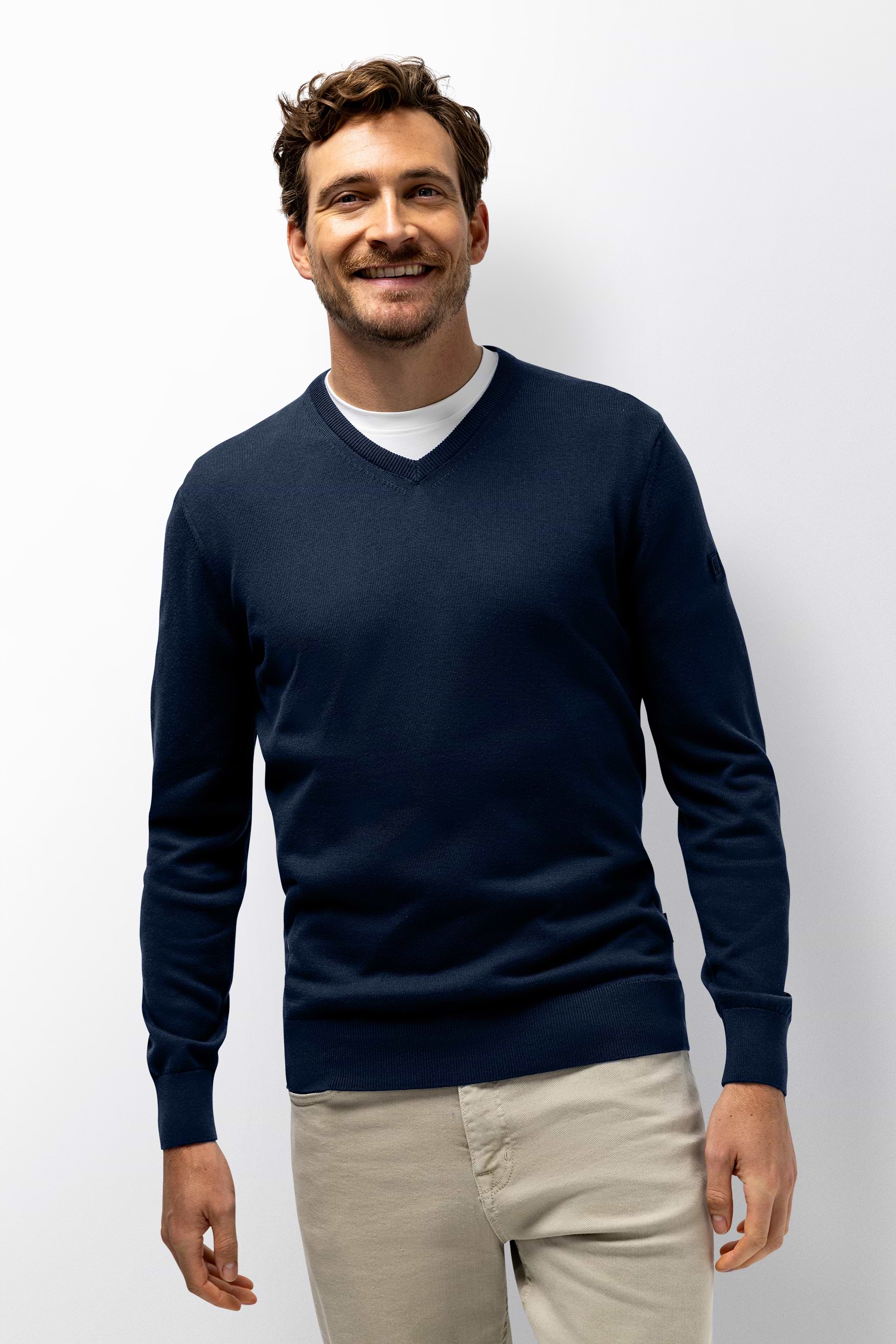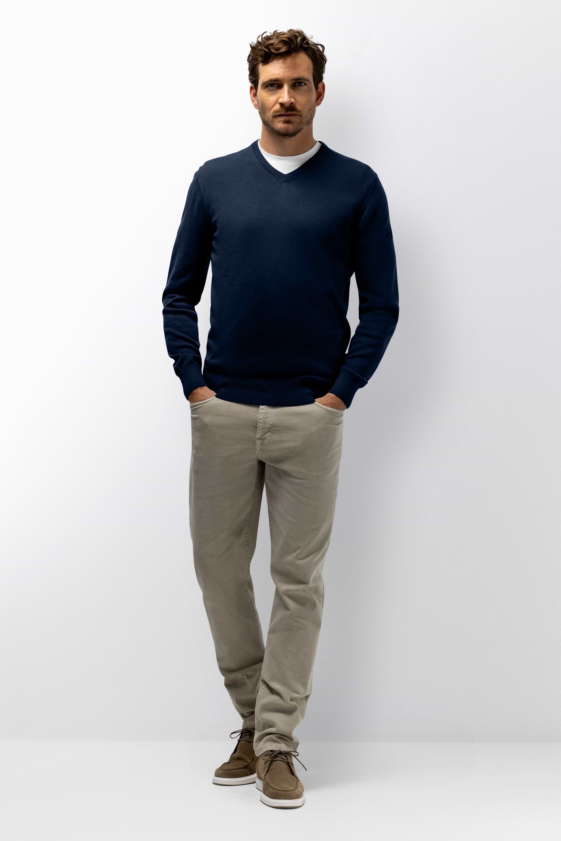 Deze regular fit trui is fijngebreid van een zachte mix van katoen en modal die licht en comfortabel aanvoelt. De V-hals zorgt voor een tijdloze uitstraling, terwijl de contraststreep aan de binnenzijde van de kraag en de rubberen badge op de mouw subtiele details toevoegen. Een veelzijdige essential die moeiteloos past bij elke stijl.