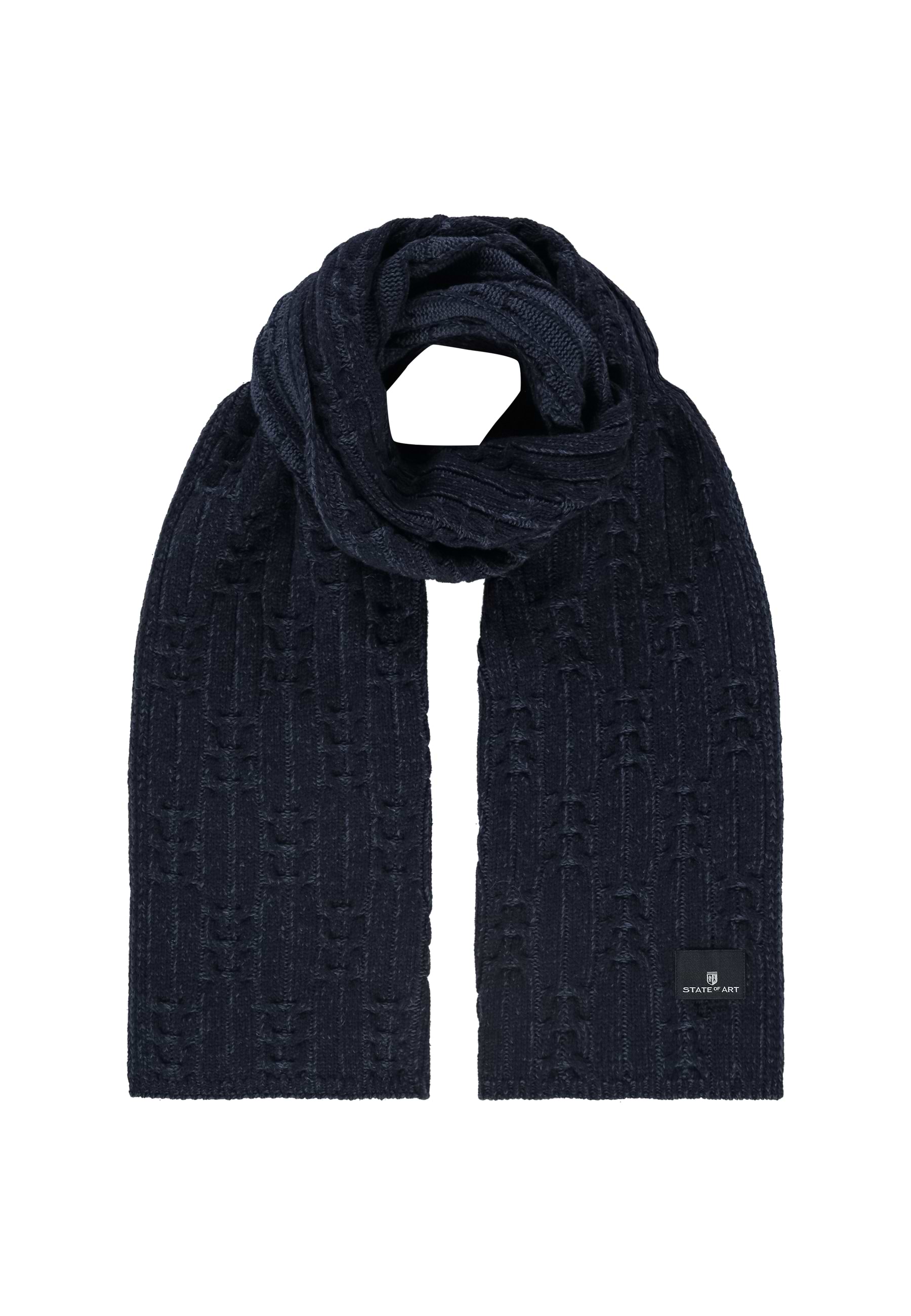 Deze gemêleerde sjaal is uitgevoerd in een mix van wol en polyamide en valt op door het kabelgebreide patroon dat zorgt voor een rijke structuur. De stof voelt zacht en stevig aan, terwijl het geweven merklabel subtiel het merk accentueert. Afmetingen: 180 x 25 cm