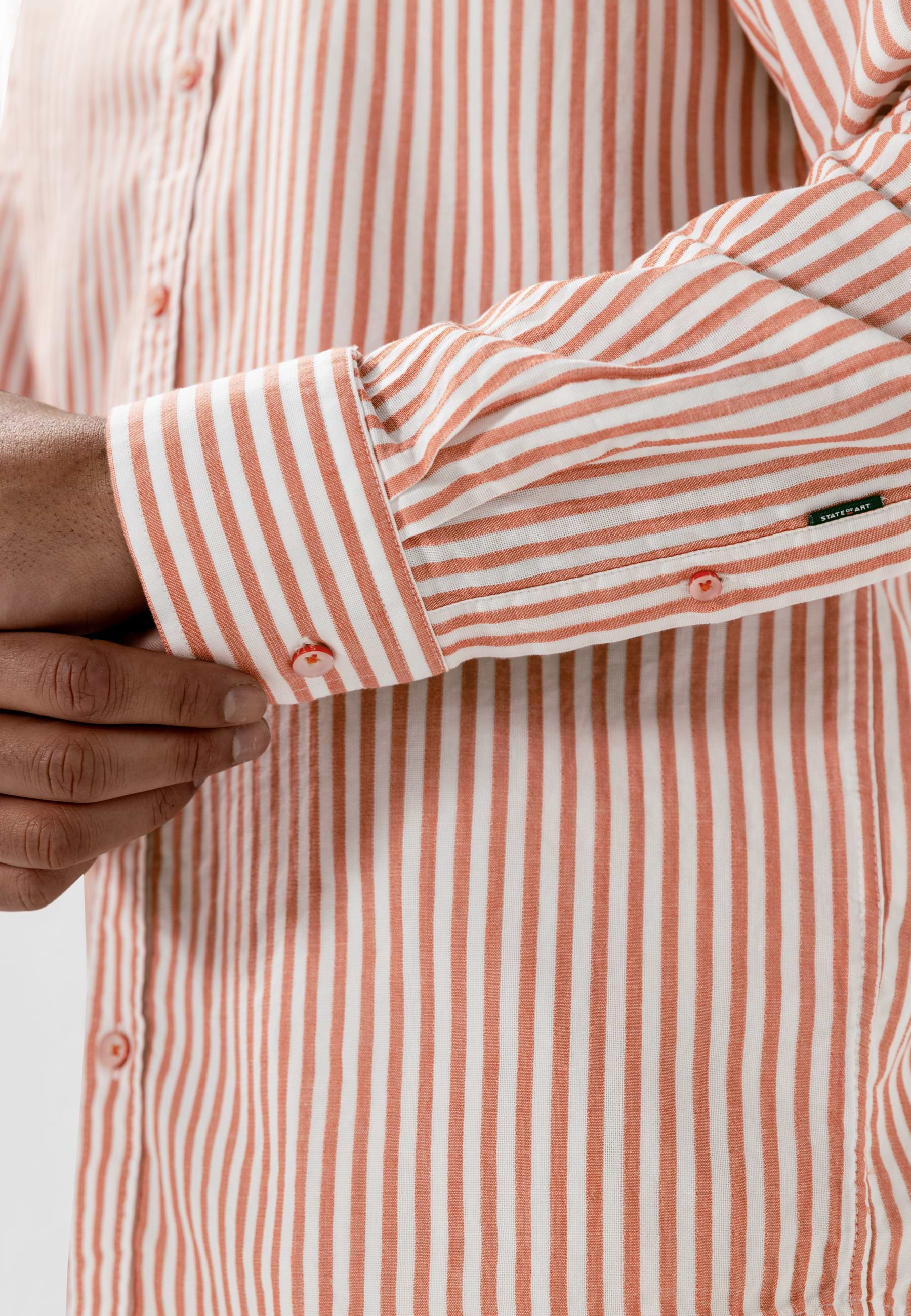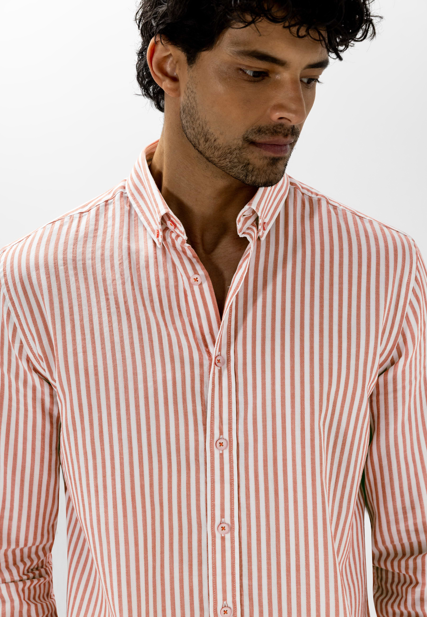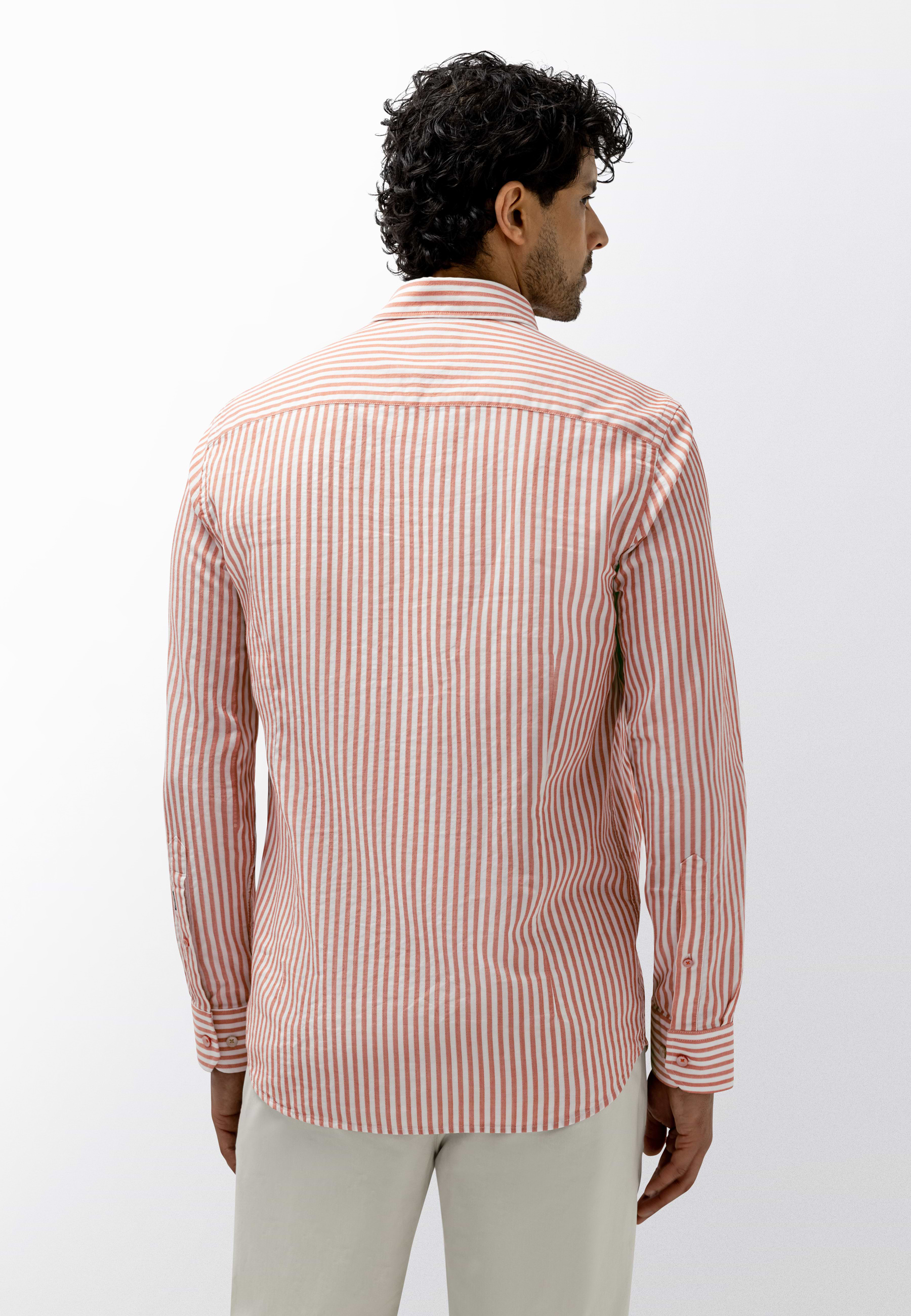 Gestreept overhemd uitgevoerd in double face stof, waarbij beide zijden een eigen uitstraling hebben en zorgen voor een subtiel gelaagd effect. Gemaakt van biologisch katoen en voorzien van een GOTS-keurmerk. De regular fit biedt een comfortabele, verzorgde pasvorm en het overhemd is afgewerkt met een button-downkraag, knoopsluiting en een strak ontwerp zonder borstzak, wat het geheel een tijdloze en rustige uitstraling geeft.