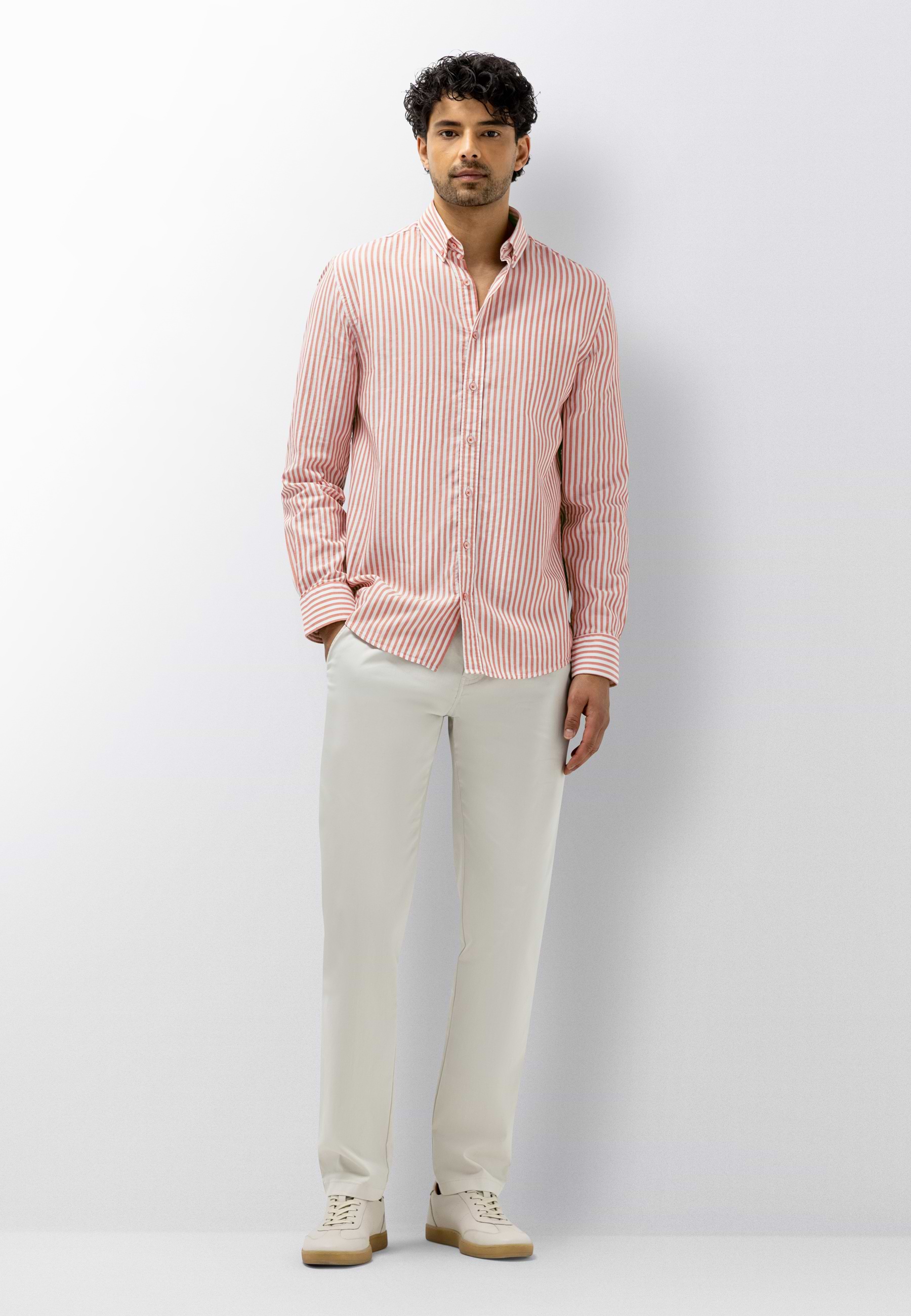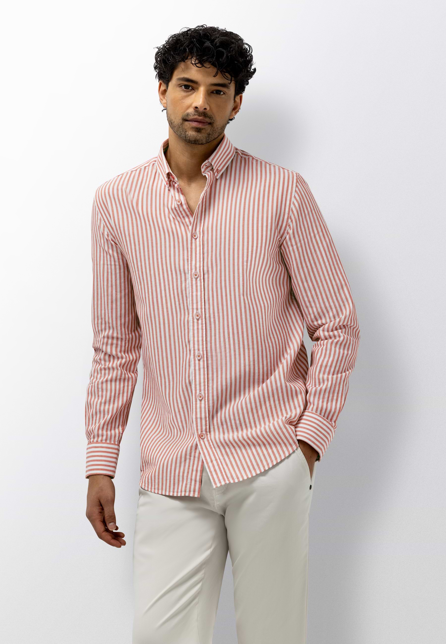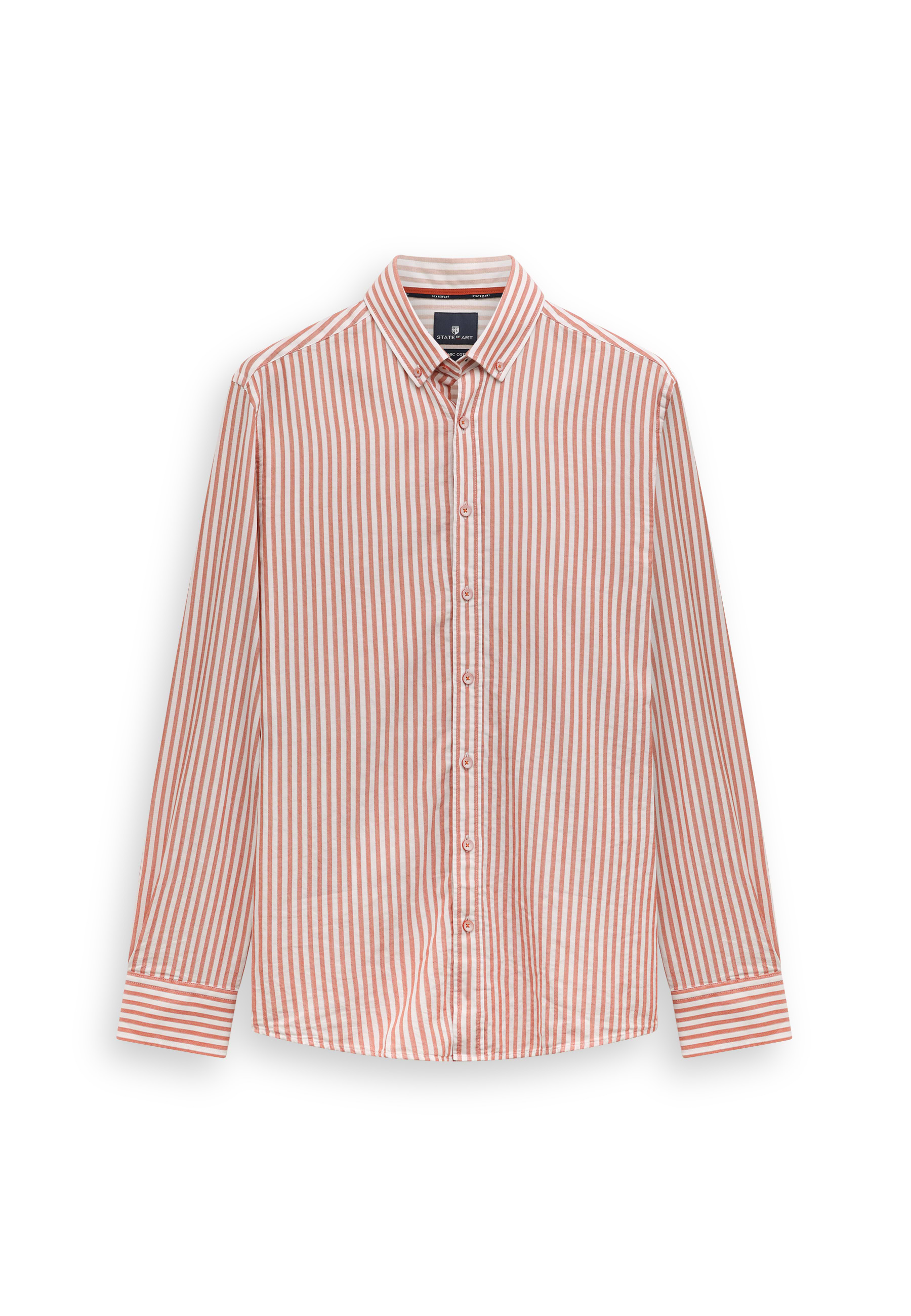 Gestreept overhemd uitgevoerd in double face stof, waarbij beide zijden een eigen uitstraling hebben en zorgen voor een subtiel gelaagd effect. Gemaakt van biologisch katoen en voorzien van een GOTS-keurmerk. De regular fit biedt een comfortabele, verzorgde pasvorm en het overhemd is afgewerkt met een button-downkraag, knoopsluiting en een strak ontwerp zonder borstzak, wat het geheel een tijdloze en rustige uitstraling geeft.